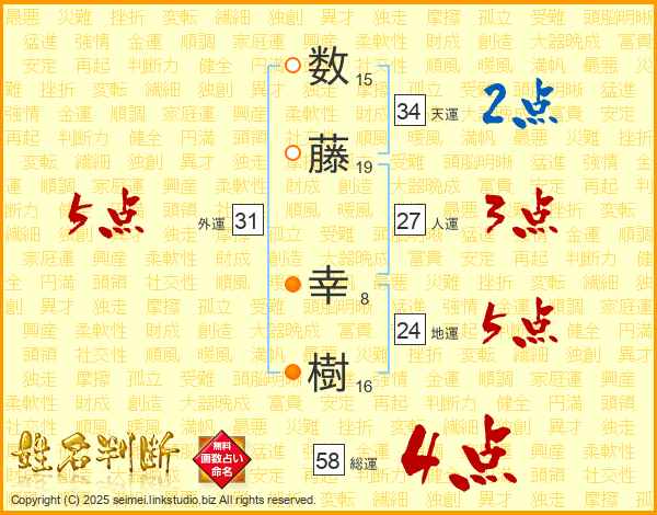 数(15画)藤(19画) 幸(8画)樹(16画)