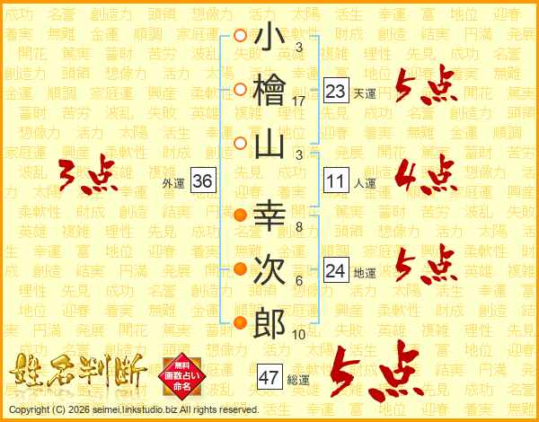 小(3画)檜(17画)山(3画) 幸(8画)次(6画)郎(10画)