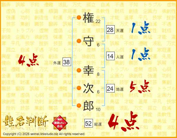 権(22画)守(6画) 幸(8画)次(6画)郎(10画)