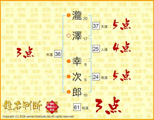 瀧(20画)澤(17画) 幸(8画)次(6画)郎(10画)