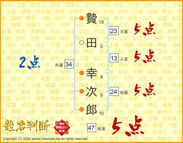 贄(18画)田(5画) 幸(8画)次(6画)郎(10画)