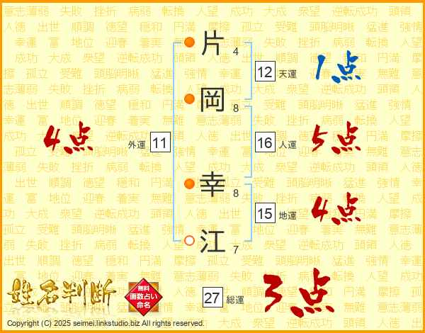 生活面を象徴する運勢です。外部から受ける影響力を表し、結婚運、家庭運や職場、環境への順応性を表します。総運から人運を引いた画数。姓や名が1文字の場合を除く。