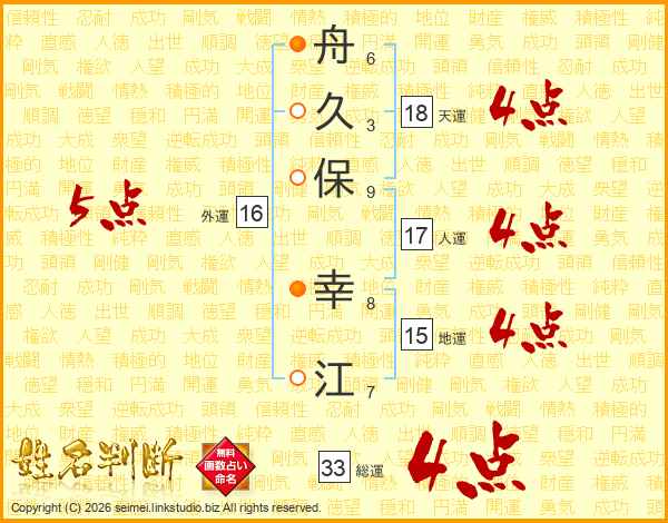舟(6画)久(3画)保(9画) 幸(8画)江(7画)