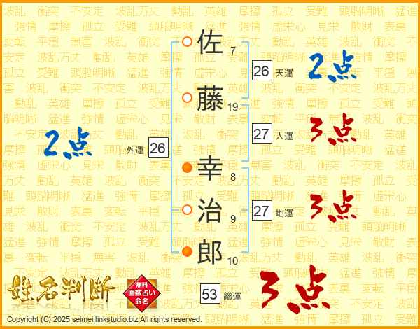 佐(7画)藤(19画) 幸(8画)治(9画)郎(10画)