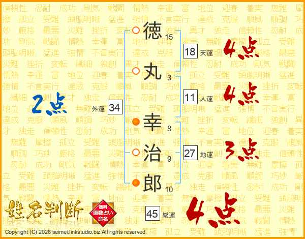 徳(15画)丸(3画) 幸(8画)治(9画)郎(10画)