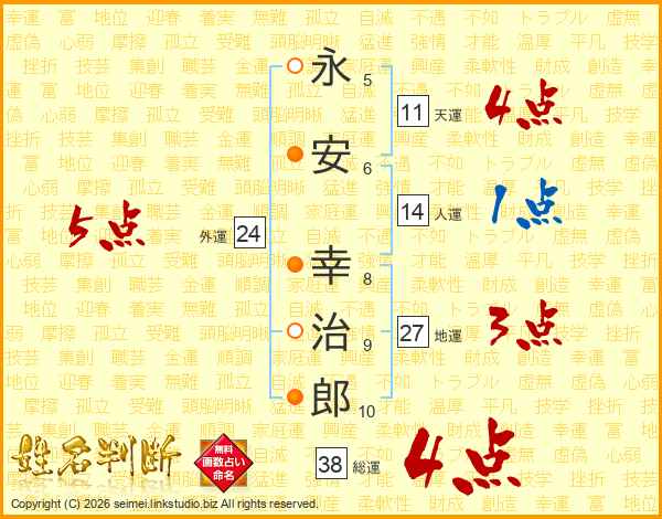 永(5画)安(6画) 幸(8画)治(9画)郎(10画)