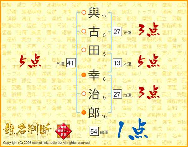 與(17画)古(5画)田(5画) 幸(8画)治(9画)郎(10画)