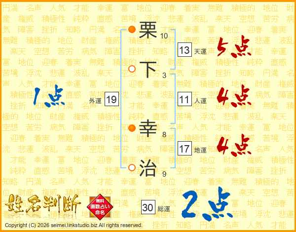 生活面を象徴する運勢です。外部から受ける影響力を表し、結婚運、家庭運や職場、環境への順応性を表します。総運から人運を引いた画数。姓や名が1文字の場合を除く。