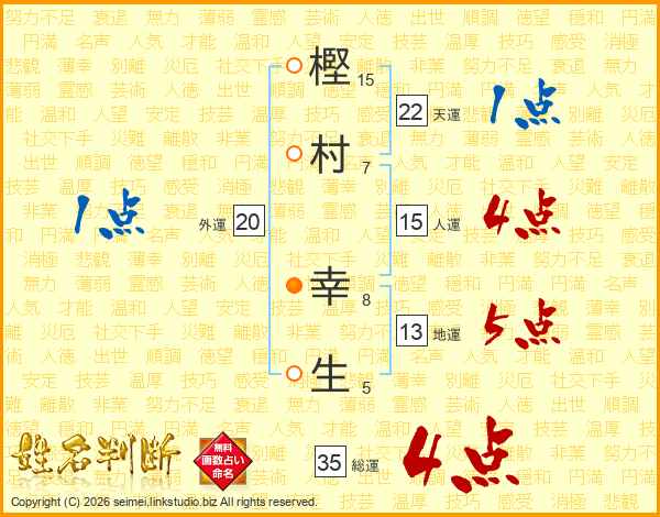 樫(15画)村(7画) 幸(8画)生(5画)