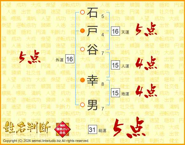 石(5画)戸(4画)谷(7画) 幸(8画)男(7画)