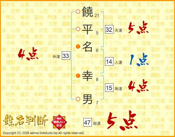 饒(21画)平(5画)名(6画) 幸(8画)男(7画)