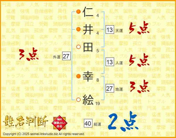 仁(4画)井(4画)田(5画) 幸(8画)絵(19画)