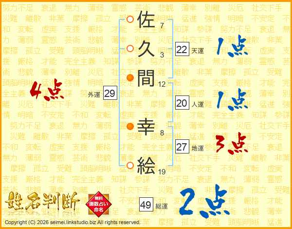 佐(7画)久(3画)間(12画) 幸(8画)絵(19画)