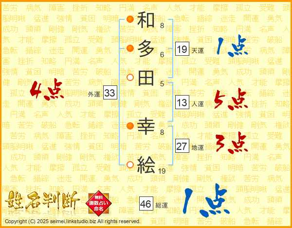 和(8画)多(6画)田(5画) 幸(8画)絵(19画)