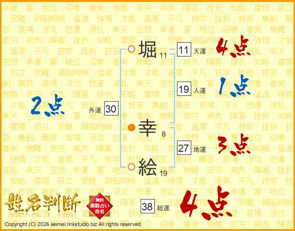 堀(11画) 幸(8画)絵(19画)