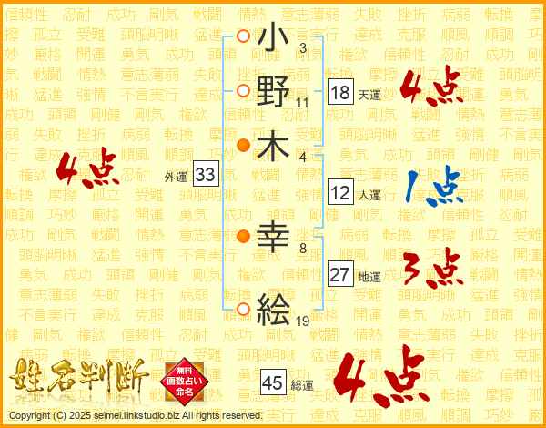 小(3画)野(11画)木(4画) 幸(8画)絵(19画)