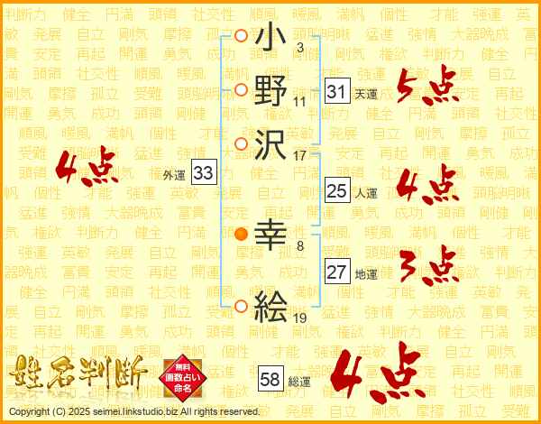 小(3画)野(11画)沢(17画) 幸(8画)絵(19画)