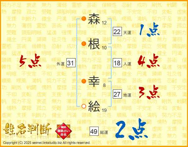 あなたの人生を表す1番重要な運勢です。生涯を通じて影響する総合運となり、主に50歳以降の晩年期に影響を及ぼします。苗字と名前の合計画数。