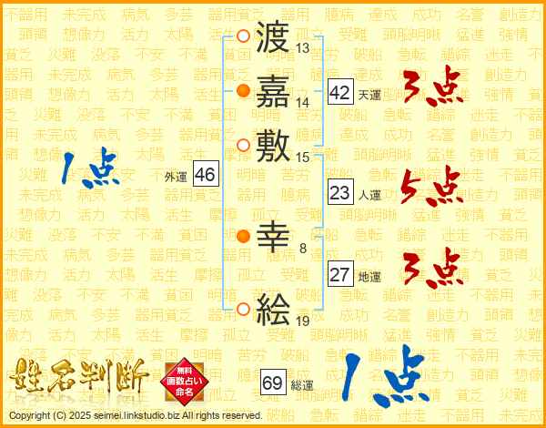 渡(13画)嘉(14画)敷(15画) 幸(8画)絵(19画)