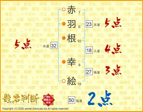 赤(7画)羽(6画)根(10画) 幸(8画)絵(19画)