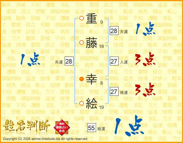 重(9画)藤(19画) 幸(8画)絵(19画)