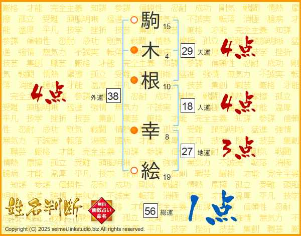 駒(15画)木(4画)根(10画) 幸(8画)絵(19画)