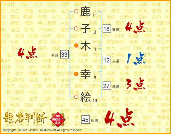 鹿(11画)子(3画)木(4画) 幸(8画)絵(19画)