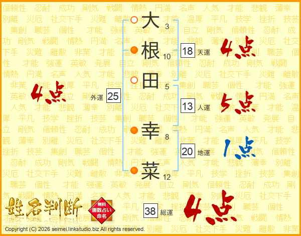 大(3画)根(10画)田(5画) 幸(8画)菜(12画)