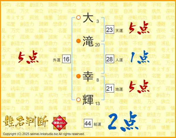大(3画)滝(20画) 幸(8画)輝(13画)