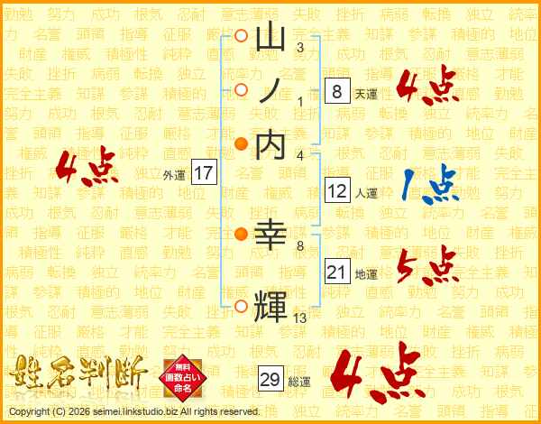 山(3画)ノ(1画)内(4画) 幸(8画)輝(13画)