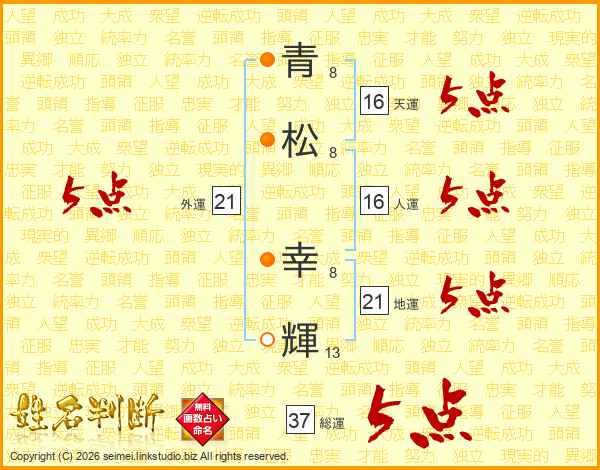 あなたの人生を表す1番重要な運勢です。生涯を通じて影響する総合運となり、主に50歳以降の晩年期に影響を及ぼします。苗字と名前の合計画数。