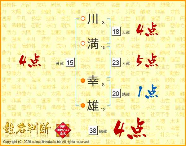 川(3画)満(15画) 幸(8画)雄(12画)