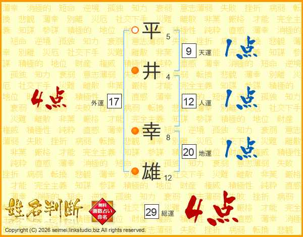 平(5画)井(4画) 幸(8画)雄(12画)