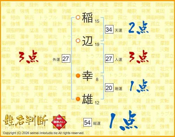 稲(15画)辺(19画) 幸(8画)雄(12画)