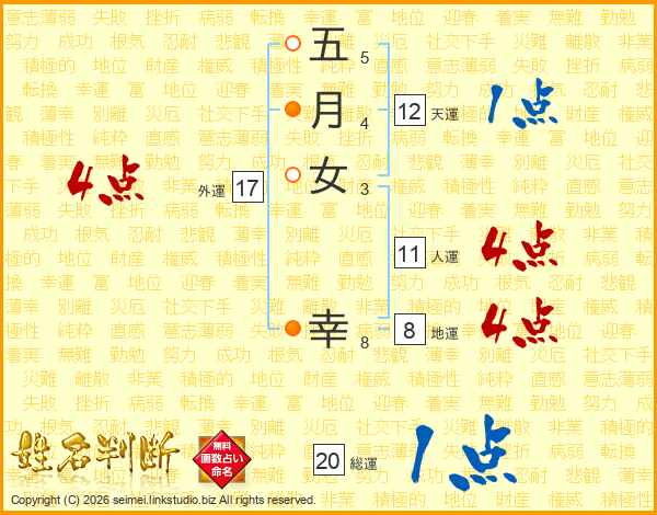生活面を象徴する運勢です。外部から受ける影響力を表し、結婚運、家庭運や職場、環境への順応性を表します。総運から人運を引いた画数。姓や名が1文字の場合を除く。