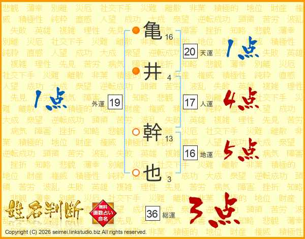 生活面を象徴する運勢です。外部から受ける影響力を表し、結婚運、家庭運や職場、環境への順応性を表します。総運から人運を引いた画数。姓や名が1文字の場合を除く。