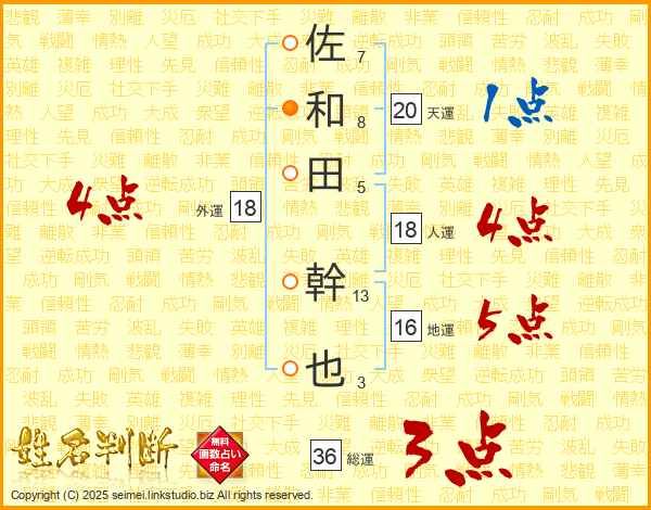 佐(7画)和(8画)田(5画) 幹(13画)也(3画)