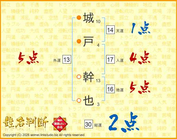城(10画)戸(4画) 幹(13画)也(3画)