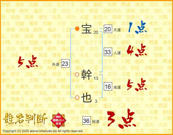 宝(20画) 幹(13画)也(3画)