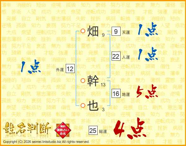 畑(9画) 幹(13画)也(3画)