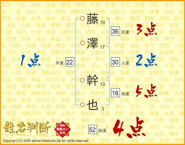 藤(19画)澤(17画) 幹(13画)也(3画)
