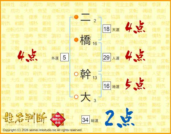 あなたの人生を表す1番重要な運勢です。生涯を通じて影響する総合運となり、主に50歳以降の晩年期に影響を及ぼします。苗字と名前の合計画数。