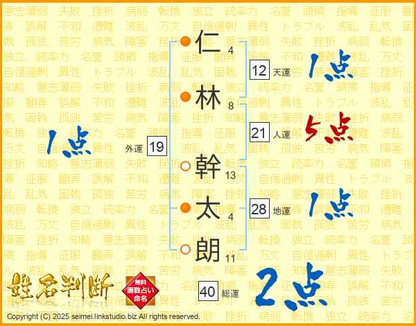 仁(4画)林(8画) 幹(13画)太(4画)朗(11画)