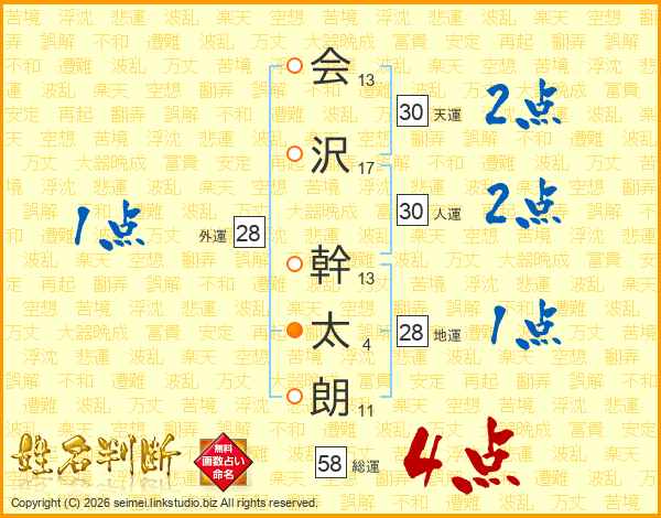 会沢幹太朗さんの総運は58画の4点!