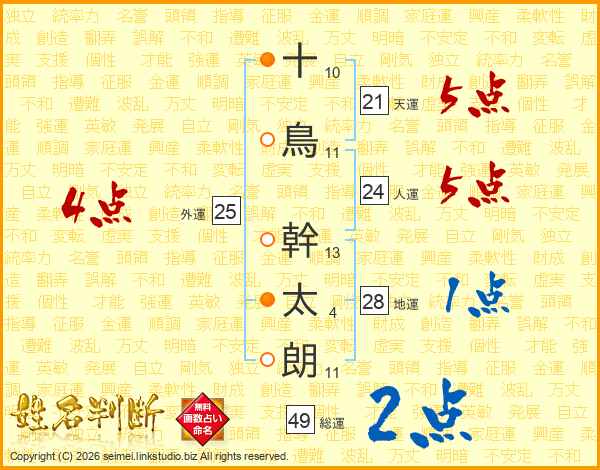十(10画)鳥(11画) 幹(13画)太(4画)朗(11画)