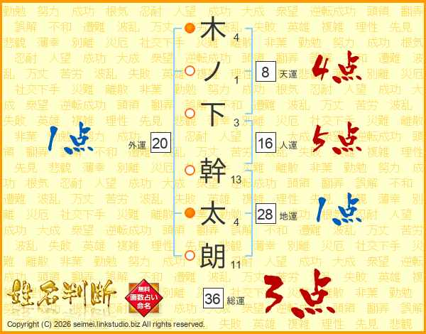 木(4画)ノ(1画)下(3画) 幹(13画)太(4画)朗(11画)