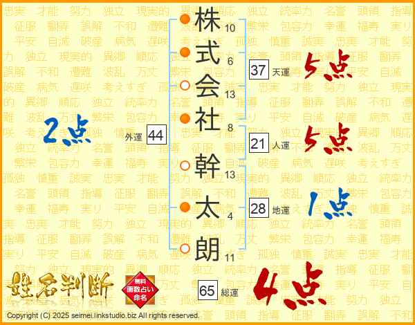 株(10画)式(6画)会(13画)社(8画) 幹(13画)太(4画)朗(11画)