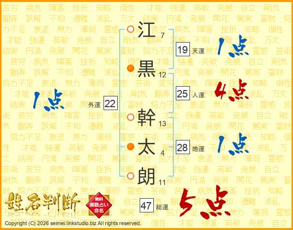 江(7画)黒(12画) 幹(13画)太(4画)朗(11画)