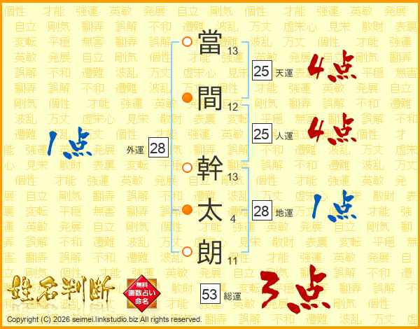 當(13画)間(12画) 幹(13画)太(4画)朗(11画)