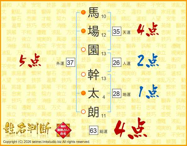 馬(10画)場(12画)園(13画) 幹(13画)太(4画)朗(11画)